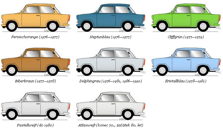 Ezek klassz anyagok, bár van bennük némi ellentmondás. Egy szó, mint száz: a Trabant színválasztéka inkább érdekes volt, mint szép. A zöldek - az én ízlésem szerint - kifejezetten csúnyák voltak minden korszakban. Bár a maga idejében a szín mindegy is volt egy Trabantnál, csak hozzák az autót mihamarabb.