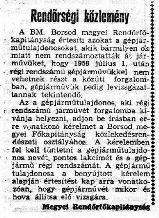 A rendszámcserét az 1/1958. (IX. 2.) B.M.-K.P.M. rendelet írta elő, új járművekre már októberben az új táblákat adták, az átrendszámozásokat november elején meg kellett kezdeni.