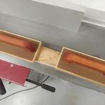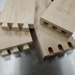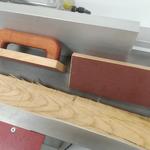Az elsőt berajzoltam nagyjából, kézi fűrésszel levágtam, majd szalagcsiszolóval össze pászítottam. Kb fél óra volt a 3 illesztés, ez nagyon sok, a másodiknál koncepciót változtattam: körfűrész darabok, egy gyors csiszolás, kész. 5 perc, az eredmény szebb lett, mint az első. :-)