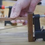 Az alsó sarkokat ragasztottam és kaptak egy csavart, ezt ragasztás után egy ugyanolyan hosszú köldökcsapra cseréltem. A háromszög felső csúcsát nemes egyszerűséggel keresztül fúrtam, kapott az is egy köldökcsapot. Másnap a felületeket össze csiszoltam, az éleket letörtem excenterrel.