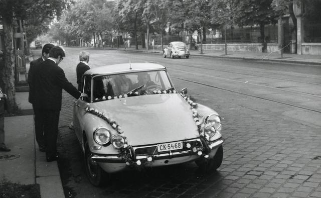 CO-066. Budapest, 1957.07.26. A Lottó tárgynyereménsorsoláson kisorsolt Wartburgot tisztítják, rendszámmal látják el a garázs dolgozói, mielőtt Szűcs Erzsébet 20 éves szegvári lakos, a Kendergyár dolgozója átveszi. (Püskiné Varga Piroska képe)