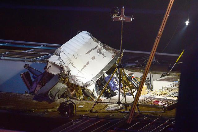 Jól látszik, hogy pl. a korlátok egy kisebb része áll, de a nagyobb része már fekszik. És persze állt a kormányállás is állt, (nyilván azt húzzák be utoljára), amit a híd kvázi megskalpolt, szerencsétlen benne lévőkkel együtt.