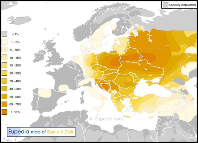 A valószínűsíthetően szláv eredetű apaági (Y-DNS) haplocsoportok gyakorisága Európában: