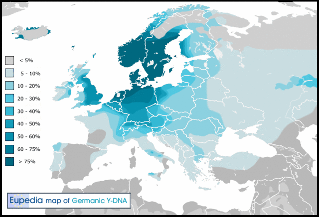 This map was computed by adding paternal lineages associated with the diffusion Germanic peoples from the Iron Age onwards. These includes Y-DNA haplogroups I1 (except some subclades of Finnish origin), I2a2a-L801, R1a-L664, R1a-Z284, R1b-U106, and R1b-L238.