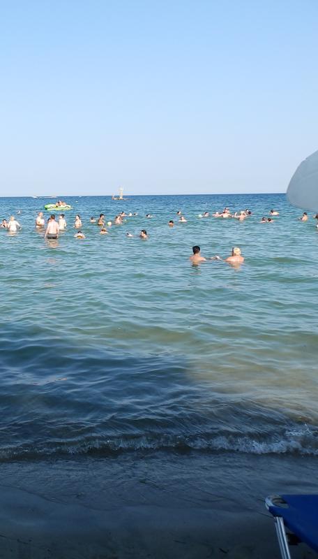Másnap egész napot a tengernél töltöttük. Hát, így hogy olvastam a tapasztalatokat nem lepett meg annyira, hogy egyetlen tűt nem lehetett leejteni annyian voltak, de ha nem olvasom, biztosan csalódást okoz. Viszont a part mentén balra sétálva kb 1 km-t egészen kellemes helyet találtunk kirakott napernyőkkel, ugyancsak első sorban, a tengertől pár méterre. A napozóágyakat 2 italért cserében adták, jó hűtött sörük volt, egy üdítővel kértük, kaptunk egy nagy tál chipset ajándékban, 7 euróért, ez meglepett, ennél sokkal többet szántam az ágy napi bérletére.