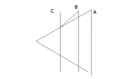 Az ut a 3, lovedek rendszereben folyamatosan kozeledik. Az A,B,C vonalak az ut helye kulonbozo pillanatokban. A V alak a ket lovedek palyaja. C pillanatban a B idopontban inditott foton eri utol az egyik lovedeket. Ez a foton, ahogy a lovedek is, folyamatosan az ut felett haladt.