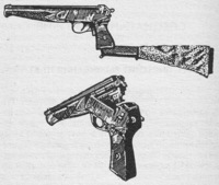 Volt néhány fajta. Legjellegzetesebb darab a Mauser M96? emlékezetem szerint eleinte 7,63 mm-es kaliberű palacknyakú lőszerrel használták, de aztán megcsinálták a 9 mm-es Parabellum kaliberű változatot is. Ennek a verziónak a markolathéjára egy bazi nagy kilences volt faragva. Na ennek a pisztolynak a tokját lehetett felcsatolni tusának.
