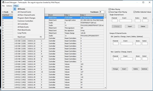 Ha egyéb meta event-ekre is kíváncsi vagy használhatod a Midiplayer beépített Event Viewer/Debugger funkcióját. Ha a Filters menüben az "All Non-Channel Events" -t jelölöd ki akkor csak a meta és SysEx event-ek jelennek meg:
