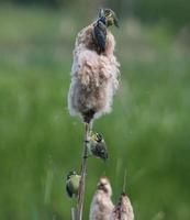 6-8, esetenként ennél is több (lejegyeztek már 15 fiókás fészekaljat is!) tojását a nőstény kelti ki. A fiókanevelés időszakában percenként hordják a fiókáknak az apró hernyókat. Az időjárástól függően óránként háromszor 2-5 perces szünetek iktatnak be.