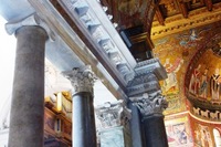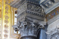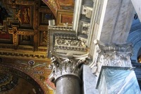 Kényszerpihenőm alatt képeket nézegetek, s a vak tyúk is talál szemet alapon észrevettem valamit többünk kedvenc templomában: a S. Maria in Trasteverében. Az apszis előtti diadalív boltívét alátámasztó oszlop gerendázata eltér a többitől, s ha jobban megnézzük, akkor lehet, hogy ismét találtunk egy antik márványt. Severus-korinak gondolom, lehet, hogy tévedek (kissé homályosan látom), ráadásul a minta a Basilica Aemilián és a Caesar-forumon is feltűnik. Egyébként ez egy korinthoszi oszlop, és ami a templomot még izgalmasabbá teszi: a főhajót korinthoszi és finom díszítésű római ión oszlopok tartják. Ezekről tudjuk, hogy valószínűleg Caracalla fürdőjéből valók, legalábbis azt hiszem, a benti 22 db. De azt nem tudom, hogy bejárat előtti 4 is onnan van-e. Ez az architráv-darab eddig nem tűnt fel.