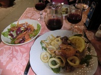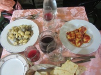 A szárd étteremben az első fogás gnocchi dello chef (petrezselymes-vargányás-kagylós) és culurgiones (gnocchi-szerű tésztába töltött ricotta, finom paradicsom szósszal) volt. A másik kép a tengeri herkentyűim.