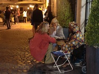 Elidőztünk még egy kicsit kint a fal tetején, majd melegebb pulcsiba bújva indultunk egy kis trasteverei esti sétára. Aki járt már ott tudja, hogy mennyire különleges hangulata van, nagy a nyüzsi sok a járó-kelő mindig. A jellegzetes házak kis utcák között nappal is jó tekeregni, de az esti zsongás különösen az. az emberek forgataga az éttermek fénye és egyéb figyelemkeltő praktikája amolyan zsibvásáros jelleget kölcsönöz helyenként. Itt még a mutatványok is alternatívok. Itt egy pillangókat árusító férfi kínálja és csípteti a falra portékáját, amott a bajszos ősz sörényű zenészt állják körbe, amíg vonaglással és síron túli hanggal fokozza a hangulatot és bezsebeli az elismerő tapsot. Amott a téren pedig egy turbános termetes kártyavető súgja a titkokat egy kapualjban.