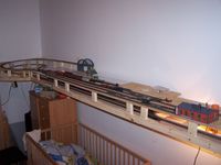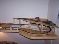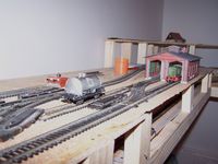 Ismét tudtam egy kicsit haladni az építkezéssel. A hétvégén beszerzeTT fűtőházat már majdnem készre szereltem, hogy az asztalon elhelyezhessem a vágányzatát. Elé egy gázolaj feladó kerül majd, selejtezeTT tartálykocsiból, és egy benzinkút fejből, utóbbit még be kell szereznem (1. kép). Elkészült a mellékvonal fele is a hídig (2-3. kép), valamint a felső állomás vágányzatát is össze raktam, de még nincs a végleges helyén (4.kép). MódosítoTTam a tápláláson is a biztosabb üzem miatt. Van egy kérdésem is: Pesten hol kaphatok mikrokapcsolókat és LED-eket? Főleg a XVI., X., IX. és XVIII. kerület érdekelne. Továbbra is érdekelnek a kritikák, észrevételek, javaslatok stb. (A fűtőház nagy álom volt, de sajna csak így fért el, kerítéssel lesz majd körbevéve, nehogy valami leboruljon :) )