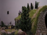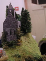 nekem tetszik a terepasztalod (a képek alapján)! Én úgy oldottam meg a sajátomon,hogy egy fenyőerdőt telepítettem a hegyoldalra! Illetve többféle Busch szóróanyaggal dobtam fel! (Igaz,nálam nem templomnak,hanem egy malomnak a környezetét kellett feldobnom.)