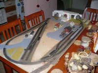 Egy már 100 - szor látott de szép TT asztal, egy Off árús főleg katalógusokkal, egy gagyis és főleg Kardos úr, aki nem kis forgalmat bonyolított, miután ő volt az egyetlen felhozatal. Majdnem vettem tőle egy páros emeletes személyvagont de világoszöld volt, ami meg nekem van az sötétzöld. Nem szeretnék tarka szerelvényt. 4500 - ra mérte.
