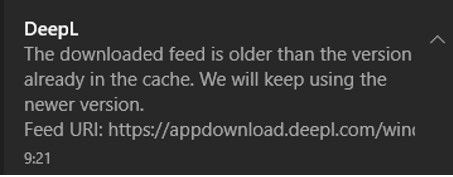 "De világosan leírja hogy a meglévő verzió a frissebb, ezért nem telepíti a másikat.". Kösz, de ezt értettem. De mivel a végén azt írta: Feed Url: http://appdownload.deepl.com..., ez arra utalt, hogy rzt töldsem le. Csak éppen nem működött.