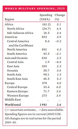 A SIPRI szerint (sved fegyvereladasokkal foglalkozo ceg) megallapitasa szerint 2020-ban (COVID ev) a nagyvilagban 531 milliard $-ert adtak el fegyvereket (beszerzesek összege). Ez a 100 legnagyobb fegyvergyarto forgalmanak összege.