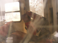 Ahol Töröcsikkel beszélget a fiú, az 1. osztályú pápaszemeseknek nézett ki így a fülkéjük. Az asztalon lévő nagy kallanytú (fűtés?), a fejtámok feletti rács (szellőzés?). A világoszöld színű asztalka is a korai győri kocsikra utal utal, ugyanakkor a belső burkolat dekorja valóban érdekes mintázatú, először azt hittem tiszafa-gyökér, de jobban megnézve a színeket és mintázatot, pávaszemes virágmintázat-féleség. Az üléshuzat sem vörös, hanem barna. Ha különkocsi lenne, én nem hagytam volna benne a rikító színű asztalkát, borzalmasan mutat. A függönyök eredeti színét nem tudom biztosra, talán szürke volt, itt meg barna. A fejtámok is nagyobbnak tűnnek a az átlagosnál. A film alapján teliablakúnak látszik a kocsi, ami meg kizárja az 1963 utáni kocsikat, lehet hogy valamilyen kis győri?