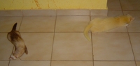 Ma hozzánk is megérkezett az új jövevény egy beige színű 6 hetes fiú. Hát nem tudom... vagy Félix volt idősebb 6 hetesnél, vagy nem tudom mi van, de ez olyan picikének tűnik, főleg Félix mostani állapotához képest, hogy szinte ijesztő a különbség... Remélem, nem lesz gond vele. Egyelőre nem evett még, de hát csak 1 órája van itthon. - úgyhogy most rettegek itt szorgosan, hogy egyen meg minden.