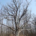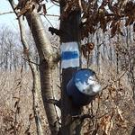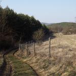 Az ösvényre való jobbos letérés jól volt jelezve, leereszkedtem a kis vízmosásba, kereszteztem, majd a túlsó oldalán felkapaszkodva következett a második útvonalváltozás: most a gyalogútról nem térnek rá a jelzések a Romhányba vezető földútra, hanem tőlük délebbre vezetnek tovább, kissé feljebb a hegyoldalban. A jelzések sűrűn vannak felfestve, az ösvény most kezd kialakulni közöttük. Egy fiataloson egy frissen nyitott úton haladtam végig, majd ismét az öreg erdő következett, de már keréknyomokon, majd egy vegyes gyertyánnal elegyes vörösfenyves. Egy többszörös útelágazásban, egy rövid szakaszon puszta figyelmetlenségből utat tévesztettem, de ezt észrevéve a jelzett, és kihagyott pár méternyi szakaszt oda-vissza bejártam. A végén aztán csak kikeveredtem a Romhányba vezető jól kitaposott földútra, de itt viszont egy friss K+ jelzésre lettem figyelmes, amit most festhettek fel a Rákóczi törökmogyorófához! Elballagtam a mezőkön keresztül a fáig, aztán nem a K+ másik ágán indultam tovább (ami már korábban is létezett), hanem visszatértem a mezőre, a kék jelzésekre.
