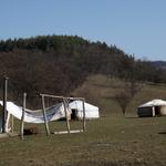 A kocsmában röviden elintéztem az adminisztrációt, behajítottam egy hideg Borsodit a gallér mögé és el is indultam, mert csigatempóm ismeretében eléggé szűkre volt szabva a táv teljesítéséhez rendelkezésemre álló idő. Alsópetényig az út a régi volt: a kocsmából kilépve és a Lókos-patak hídján átkelve rátértem a kék jelzésre, elsorjáztam az Almásy (Almássy?) kúria elhanyagolt parkja és a volt tsz telephelye mellett, majd az utolsó tanyáknál rátértem a jól kijárt, cseppet sem sáros keréknyomokra, amik aztán átvezettek Alsópeténybe. A faluszéli jurtatáborban éppen dolgoztak: szellőztették a sátrakat, néhány ponyva kiterítve hevert a kora délelőtti napsütésben.