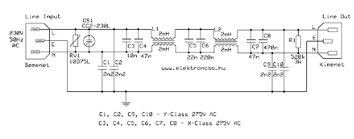 Ha a feszültség 230V és az ellenállás 1,4 millió ohm, akkor az ott átfolyó áram 0,16 milliamper. De ebben a zavarszűrőben két "fázis-föld" kondenzátor van, tehát ez a zavarszűrő összesen 0,32 milliamper áramot vezet földelés felé.