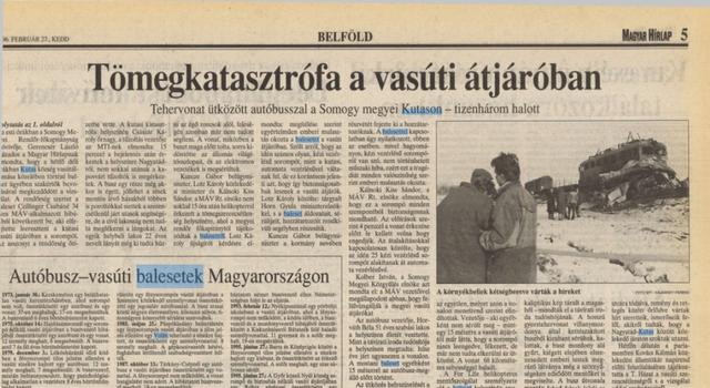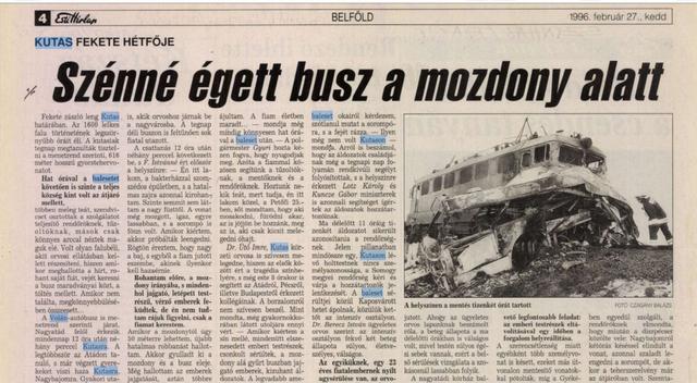 Fekete zászló leng Kutas határában. Az 1600 lelkes falu történetének legszörnyűbb óráit éli. A kutasiak tegnap megtanulták tisztelni a menetrend szerinti, 616 méter hosszú gyorstehervo- natot. Hat órával a balesetet követően is szinte a teljes község kint volt az átjáró mellett, többen meleg teát, szendvicset osztottak a szolgálatot teljesítő rendőröknek, tűzoltóknak, mások csak könnyes arccal néztek maguk elé. Volt olyan falubéli, akit orvosi ellátásban kellett részesíteni, hiszen amikor meghallotta a hírt, rohant saját fiát, vejét keresni a busz maradványai közt, a töltés mellett. Amikor nem találta, megkönnyebbülésében összeesett... A Volán-autóbusz is menetrend szerinti járat, Nagyatád felől érkezik mindennap 12 óra után néhány perccel Kutasra. A legtöbbször az Atádon tanuló, s már végzett gyerekeket viszi haza Kutasra, Nagybajomra. Gyakori utasok a buszon az idősebbek is, akik orvoshoz járnak be a nagyvárosba. A tegnap déli buszon is feltűnően sok fiatal utazott. A csattanás 12 óra után néhány perccel következett be, s F. Istvánná ért először a helyszínre: — Én itt lakom, a bakterházzal szomszédos épületben, s a hatalmas zajra azonnal kirohan-y tam. Szinte semmit sem láttam a nagy füsttől. A vonat még mozgott, igaz, egyre lassabban, s a sorompó is fönn volt. Amikor kiértem, akkor próbálták leengedni. Rögtön éreztem, hogy nagy a baj, s egyből a fiam jutott eszembe, akinek ilyenkor kell hazaérnie. Rohantam előre, a mozdony irányába, s mindenhol jajgató, letépett testrészű, vérző' emberek feküdtek, de én nem tudtam rájuk figyelni, csak a fiamat kerestem. Amikor a mozdonytól úgy 50 méterre lehettem, újabb hatalmas robbanást hallottam. Akkor gyulladt ki a mozdony és a busz eleje. Még hallottam az emberek jajgatását, aztán többre nem emlékszem, én is el ájultam. A fiam életben maradt... — mondja még mindig könnyesen hat órával a baleset után. — A polgármester Gyuri hozta kézen fogva, hogy nyugodjak meg. Azóta a fiammal közösen segítünk a tűzoltóknak, a mentőknek és a rendőröknek. Hoztunk nekik teát, mert tudja, én itt lakom közel, a Petőfi 25.- ben, sőt mondtam, hogy aki mosakodni, fürödni akar, az is jöjjön be hozzánk, meg az is, aki csak kicsit melegedni óhajt. Dr. Ütő Imre, Kutas körzeti orvosa is szívesen melegedne, hiszen az elsők között ért a tragédia színhelyére, s még este 8 órakor is segített az Atádról, Pécsről, illetve Budapestről érkezett kollégáinak. A borzalomról nem szívesen beszél. Mint mondta, még gyakomokko- rában látott utoljára ennyi vért. — Amikor kiértem a sín mellé, mindenütt elszenesedett emberi testrészek, csonkolt sérültek, a mozdony alá gyűrt buszban jajgató emberek, kizuhant áldozatok. A legvadabb amerikai horrorfilm sem produkálhatna véresebb jeleneteket — mondja, miközben a mentést irányító rendőr alezredsessel közösen intézkedik az utolsó emberi testrészek összegyűjtéséről. Egyed György, a polgár- mester sem mozdul a roncsok mellől, a szerencsétlenség után azonnal lezárt vasúti átjáróban ügyel. Mindenkihez van egy-két nyugtató szava, legfeljebb az újságírókat nézi egy kissé morcosabban. Amikor a baleset okairól kérdezem, szótlanul mutat a sorompóra, s a fejét rázza. — Ilyen még nem volt Kutason — mondja. Arról is beszámol, hogy az áldozatok családjának még a tegnapi nap folyamán rendkívüli segélyt folyósítottak, s a helyszínre érkezett Lotz Károly és Kuncze Gábor miniszterek is azonnali segítséget ígértek az áldozatok hozzátartozóinak. Ma délelőtt 11 óráig tizenkét áldozatot sikerült azonosítania a rendőrségnek. Jelen pillanatban mindössze egy, Kutason lévő holttestnek nincs személyazonossága, a Somogy megyei rendőrség kéri és várja a hozzátartozók jelentkezését. A baleset sérültjei közül Kaposvárott hetet ápolnak, közülük kettőt az intenzív osztályon. Dr. Berecz István ügyeletes orvos szerint az intenzív osztályon fekvő két beteg állapota súlyos, életveszélyes, válságos. Az egyiküknek, egy 23 éves fiatalembernek nyílt agysérülése van, az orvosi team elkeseredetten küzdött az életéért, de ma reggel beállt nála az agyhalál. A másik egy 13 éves fiú, súlyos égési sérüléseket szenvedett. A sebészeten dr. Berecz beszámolója szerint öt sérültet ápolnak, akiknek állapota súlyos, de nem élet- veszélyes. A Kaposvárra beszállított további két égési sérültet ellátták, majd hazaengedték. Életveszélyes sérültből a pécsi Honvéd Kórházba is A helyszínen a mentés tizenkét órát tartott jutott. Ahogy az ügyeletes orvos lapunknak beszámolt róla, a beteg állapota a ma délelőtti órákban is válságos volt, mivel testén súlyos égési sebek vannak, ezért a belső sérülések vizsgálata a szokásosnál lassabban folyik. A nagyatádi kórház baleseti osztályán ápolt négy sérült állapota súlyos, ám csak egyiküké életveszélyes. Itt egy kilenc hónapos kislány életéért is küzdenek az orvosok. A rendőrség és a MÁV szakembereinek azonnal intézkedniük kellett a baleset után, hiszen a felsővezeték leszakadt, a tartóoszlopok mindenhol kidőltek: Kaposvár és Gyékényes között állt a közlekedés. Az intézkedő rendőrök elmondták, a balesetet kö vető legfontosabb feladat: az emberi testrészek eltávolításával egy időben a forgalom helyreállítása. A szerencsétlenség miatt egyébként több személyvonat is késett, ezeket más útvonalon mentesítő vonatokkal pótolták, míg a Gyékényesen át Budapestre tartó Kvamer expresszt a Balaton felé irányították át. Érdekes, hogy a baleset napján ezen a vonalon ez volt az egyetlen tehervonat, melyet menetrend szerint elindítottak. A vonat vezetője, aki karcolás nélkül megúszta a t