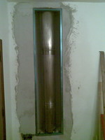 A kályha a nappaliban van, ami kb 18 nm, abból nyílik a kályhával szembeni oldalon a zuhanyzó és a konyha, ami 5+5 nm. A kályha mellett közvetlen egy másik nyitott ajtó, ott a szoba. A falon átmegy a füstcső, ott egy Radeco hődobon keresztül fordul vissza a 14*14 cm-es kéménybe a füstcső.