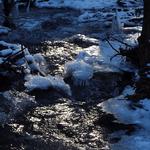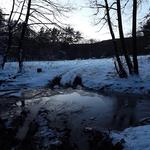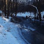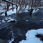 Nem volt más választásom. Egy percre felmerült bennem a perverz gondolat, hogy leveszem az amúgy is vizes cipőmet és zoknijaimat és feltűrt nadrággal átmegyek a patakon de elvetettem. Nem volt vonzó a kb. 2 fokos víz és a pár centi folyó víz alatt terpeszkedő kásás jég. Ha megcsúszok vagy bármilyen okból egyensúlyvesztés következik be akkor táskástul mindenestül beleborulok a patakba. Az úgy igen vidám lett volna, így inkább kerültem.