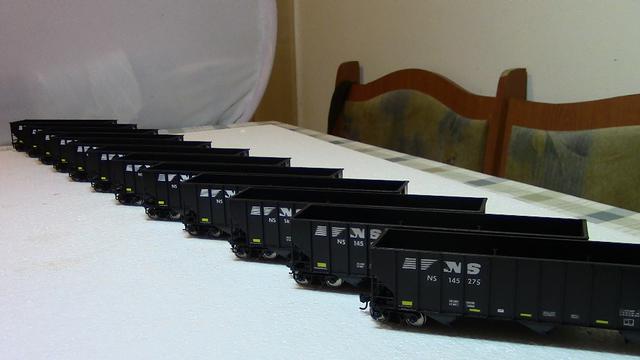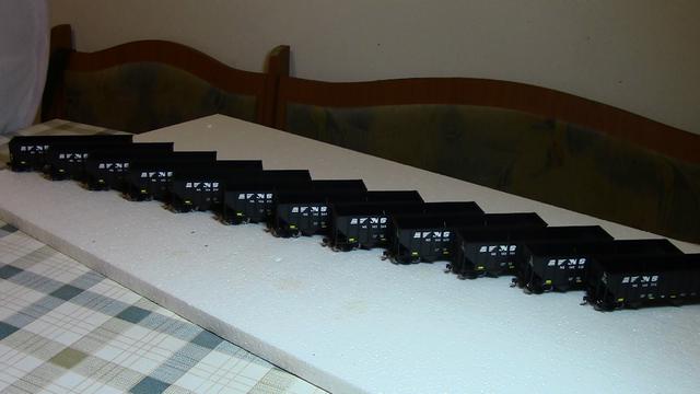 Most átfestve 2x6-os Walthers NS az 12db , + W. Mainline 2db 3bay NS és Conrail , 2db 4bay NS , + 5db Bachman NS ebből 3db-ot majd át kell számozni , + 7db Bowser PPLX sajnos csak az utolsó sorozatot kaptam el és már pár éve nem adnak ki PPLX-et . Az összesen 28 db coal hopper.