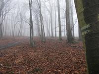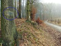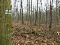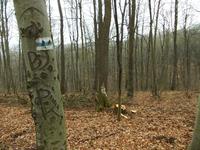 Így aztán egy hete szombaton reggel elindultam a mai kék +-on, a legelső kéktúra útvonalán. Kellemes szekérút volt, és egy negyedóra múlva meg is láttam az első régi kék jelzést egy nagy bükkfán. Túlzottan újnak találtam, ezért gyanús lett a dolog.