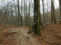 Rózsaszín: ez áll legjobban az OKT nyomvonalához, de ahogy írod, egyszerre elfogyott a jel. Nos, itt lehet az általam említett lejtős völgyecske, ami csaknem északi  (ÉÉK) irányba levisz a köves útra. Innen alig több, mint 100-120 méter, ahogy Hev is írta. Ezt vagy elnézted és tovább mentél ÉNY felé, vagy valóban van egy jelkiesés, ami bezavart. De ott lefelé illene látni kitaposott ösvényt, persze, ha az avar nem fedte be teljesen. Mert hó ugye az nálunk idén télen még nem volt. Esetleg fakidőlés?