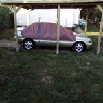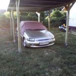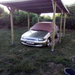 Szerkezetileg megvan,be kell zsaluznom, betonoznom az oszloptartó vasakat,majd száradás után jön az oldala,hátulja,stb.Nem betonoztam le előre,mert sejtettem,hogy a rossz talajviszonyok miatt sem derékszöget,sem vízszintet nem lesz egyszerű megoldani,hála a majdnem sógoromnak jól sikerült az eddigi akció.A betonozás utáni lécezés,oldal kialakítás majd a fizu után aktuális.