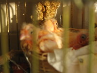 Raktam ma oda nekik egy szem cseresznyét, úgy félnek tőle mint a tűztől. fél órába telt mire meg merték közelíteni. Ha valami vészhelyzet van (mondjuk kukkoló vagy lesifotós (én) :) akkor a fiú hangosan nemtetszését fejezi ki. vinnyog. ha valamitől félnek pl cseresznye, akkor a lány szabályosan zavarja fiút oda, hogy "menj már nézd meg mi az" Műltkor erre Barnabásom inkább kirohant a kalitkától, de a cseresznyét nem merte megközelíteni.