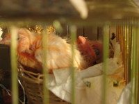 Ma 6 naposak, már nyitva a szemük. Apuka annyit eszik mint egy disznó :) szerintem már jól elhízott. Ő csak módjával etet, olyan jut is marad is technikával. Pár falatot ad a kicsiknek, de hiába tátognak tovább, csak nézi őket, gondolja magába nekem is maradjon a begyembe valami :) Néha megeteti anyát is, de a nap nagy részében lakmározik saját örömére. Este szabályosan lefeszik a rúdra :) a hasa lóg lefelé lábai kisem látszanak alóla. meg a rúd sem :)