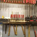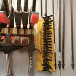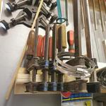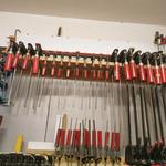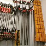 Vannak különböző méretű csipeszek, rövidebb, hosszabb egykezes szorítók, régi vasöntvényes szorítók, sarokszorítók és van pár darab nagy méretű saját készítésű táblásító szorítom. A műhely egyik 3 méteres falát beborítja az asztal tetejétől a mennyezetig a fal ahol tárolom őket. Pontos darabszámot nem tudok, de úgy saccra 110 darab körül lehet. Ennyi azért egy egyszemélyes műhelyben már elég szokott lenni. Mondjuk amikor a konyhabútort készítettem akkor kevés volt a nagy szorítókból :) Persze nagyrészt olcsó szorítók amik a kisebb munkákhoz elég, és van pár darab erős berger szorító is.
