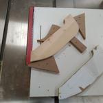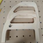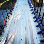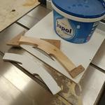 120x60 a célkeresztmetszet, de csak ilyen anyag volt a zatikban, 22mm-es gyalult, ezért ragasztok 3-at össze. Ez az egyik rövid oldal lába lesz, gérbe vágott, fordított U alak. Egy darabból csinálom, mert így a mintázat körbe fog futni a lábon. A két láb között egy torziós box fogja tartani az asztallapot, ami jelen állás szerint kompaktlemezből lesz (12mm vastag). Van egy minta asztal, ahonnan az ötlet jött.