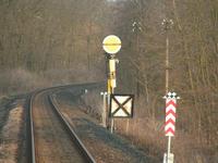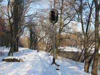Ha már itt voltam, elindultam felderíteni a vonalat. Hangulatos lehetett a szolgálat a folyóparti pályán. A biztosítóberendezés egyébként ugyanaz, ami a nagyvasúton, feltételezem, hogy ez vonatkozik az összes jelzőre is. A szelvénykarók érdekesek: két oldalukon különböző szám van. Nem kell találgatni, hogy melyik a kezdőpont vagy a végpont, ha beállok egy szelvénybe, egyforma számot látok, akármerre nézek, abban a szelvényben vagyok. Itt például a kilencedikben.