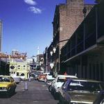 Losonci utca mára elbontott szakasza a Szigony utca felől a Kálvária (Kulich Gyula) tér felé nézve, a kétemeletes háznál jobbra az Illés utca, háttérben az Állami Déryné Színház neonja.