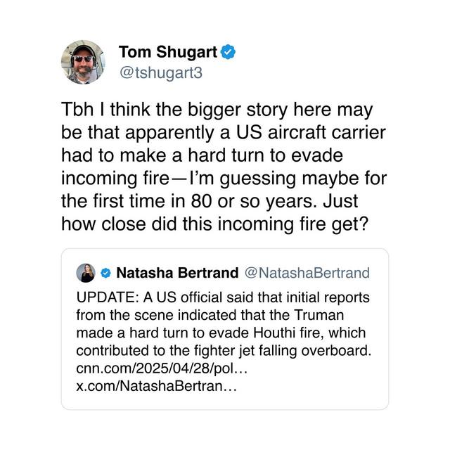 Tegnap pl. "leesett" egy super hornet egy hordozó fedélzetéről, állítólag azért, mert a hordozó éles kitérő-manővert tett egy houthi rakéta miatt.