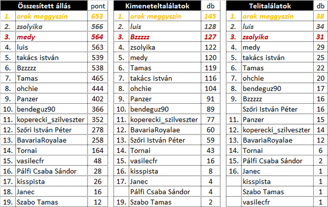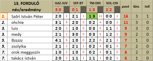 kimenetel és az egyik csapat góljainak eltalálása: 4 pont(1-2 a tipp,de 1-3 lett)