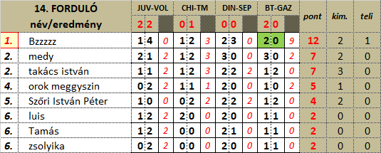 csak az egyik csapat góljainak eltalálása: 1 pont(tehát pl. 1-2-őt tippeltél,de 2-2 lett)
