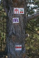 Egyébként a Nyugati-Gerecsében is újabb festések nyomai láthatók, melyek pl. a Tuhun nem észlelhetők. Felújították a Kőpite-hegy - Dunaszentmiklós között vezető Zöld keresztet. Sőt: ez a jelzés továbbvezet kelet felé - talán az egykori Zöld keresztetfelidézve. Én a Nagy-Somlyó északi lábáig, a Neszmélyi arborétumig tudtam követni. A Zöld sávjelzés is Dunaszentmiklósról indul és a Gorba-tető nyergén - Tardoson - Bánya-hegyen át Héregig tart. Ezen kívül az Agostyán melletti Száz-völgyben Sárga kereszt, a Gorba-tetőtől északra Sárga sávjelzés nyomait észleltem.