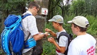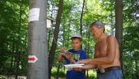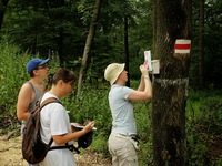 Kéktúra Kisinóc - Nagymaros Eredetileg Nagyhideghegytől akartuk befoltozni ezt a szakaszt, de sajnos a turistaház tulajdonosváltása miatt a turistabusz nem járt, így gyorsan gondolkodtunk Ákos bácsinál, és mire a korsó végére értünk, meg is született a B terv. Így gyorsan felgyalogoltunk Kisinóci th.-hoz, ahol a nagy melegre való tekintettel a sör sem maradt ki a pecsételés közben. Innen elindultunk a már ismert, változott útvonalon, de aztán a változtatáson is változtattak, az út a szekérútról letért és egy ösvényen mentünk tovább, ami kissé lerövidítette a szekérutas változatot. A változás jól ki volt jelölve, szabványos törlőkereszt, és az új útvonalon szépen felfestett jelzések mentén haladtunk. Hamar felértünk a kálváriához is, ahonnan ereszkedve gyönyörködtünk a tájban, és örültünk a szép időnek. Beérve Kóspallagra találtunk egy működő nyomós kutat, itt felfrissítettük magunkat és nekivágtunk a következő szakasznak, hiszen Törökmezőn terveztük az ebédet. Az aszfaltról felüdülés volt végre az árnyas erdőbe lépni, még ha emelkedett is az út. Itt is pár helyen az erdészeti úttal párhuzamos ösvényeken vezetett az út, de már kezd kialakulni az ösvény, és jól járható volt. Még békás rét előtt találkoztunk a kéktúra útvonalát igen jól ismerő ismerősünkkel, aki figyelmeztetett is, hogy elterelés van ott is. Hamar bele is futottunk az útlezáró villanypásztorba, amely mellet az ösvény jól, láthatóan kijelezve, be is vezetett az erőbe. itt 350 méteren keresztül az eredeti úttal párhuzamosan a szokásos módon vezettek a jelzések, de szemmel láthatóan nem a Kóspallagnál megszokott kezek által festett szép jelzések voltak. Ahol a kék sáv régen elfordult jobbra, az ösvényen még tovább előre voltak festve a jelzések, mintegy 100 méteren keresztül, majd eltűntek a szemünk elől. Valószínűleg jobbra kellett volna kanyarodnunk, de ezt fordulást jelző nyíljelzés nem jelezte, és jobbra behívó jelzéseket meg ha netán voltak is, nem vettem észre. Így mentünk még kb 100 métert, majd jelzések híján, jobbra kanyarodtunk egy szintbéli szekérúton, mert visszamenni az emelkedőn már nem volt kedvünk. Még azért keresgéltük a jelzéseket, de elveszettnek nem éreztük magunkat, hiszen Törökmezőről elég hangosan jöttek egy rendezvény hangjai. Hamar vissza is csatlakoztunk a jelzett útba. Törökmezőre érve nagy tömeget tapasztaltunk, és ráadásul elég hangos zene is szólt, szerencsére a turistaházba annyira nem hallatszott be, de akik kint ültek le elfogyasztani a hozott elemózsiát, ők nagyon panaszkodtak, hogy egy újabb hely, amit a természet hangjait kedvelő turisták már úgy tűnik nem élvezhetnek. A gulyásleves azért finom volt, bár lassan került az asztalra, mert a nagy tömegben nehéz volt megtalálni a felszolgálót. Köves-mezőig eseménytelenül telt az utunk, leginkább az árnyékot keresgéltük, majd egyre közelebbről hallottuk az ég dörgését. Így a csapat ketté vált és az egyik fele a kék kereszten ment le Nagymarosra, de páran még kitartottunk, és meglátogattuk Julianus Barátunkat, és szerencsére nem eredt el az eső, de körbe nézvén láttuk, merrefelé esik az eső. Innen lesétálva Nagymarosra még maradt egy fél órányi időnk a vonat indulásáig, amit frissítéssel használtunk ki, és a pékségben a másnapi betevőt is beszereztük. Már jócskán a vonaton ültünk, amikor utolért a vihar. Nagy szerencsénkre a Nyugatiba meg még a vihar előtt érkeztük, és ahogy beültünk az autóba, csak pár perc után ért el a jégeső. Sok helyen csak "emlékezetből" vezettem haza, olyan sűrűn esett :)