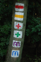 A jelzésfonódások egy gyöngyszeme (Az iménti cikkemhez kiegészítésként szánom, a fonódások által előállt helyzet illusztrálására. Arról nem is beszélve, hogy felújítások alkalmaával "illik" a fonódó jelzésket is felújítani - az ilyen és hasonló útszakaszok azért nyelik bőven a pénzt, időt, munkát. Nemrég írtam Dobogókőről, ahol egy rövid szakaszon 10-11 jelzés halad együtt). A helyszín Szépjuhászné, de ez nem is érdekes: