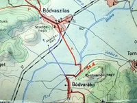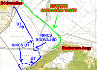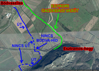A régi nyomvonalon hol van út, hol nincs, ráadásul az átkelésnél egy Bódva-híd is hiányzik - ezeket kékkel jelöltem.