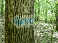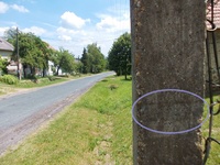 Mikor valamerre elvetődök az országban lehetőségeim szerint igyekszem keresgélni a régebbi kék útvonalakat, így volt ez a múlt hétvégén is, a Balaton-felvidéken. 20-30 éves jeleket gond nélkül lehet találni sok-sok helyen, sziklákon, fákon, erdőkben, elsősorban persze olyan erdőkben ahol nem volt mostanában tarvágás. (paradicsomi állapotok uralkodnak ebből a szempontból a Burok-völgyben, a Dobogó-tetőn Hollókő után, vagy éppen a Gerecse-tetőn) 40-50 éves jeleket viszont már jellemzően inkább csak sziklákon, kis falukban általában a beton villanyoszlopokon lehet találni, ha még nem cserélgették ki őket. Zalaszántón a Várvölgy felé vezető kis utcában szerencsére még a régi oszlopok vannak, így aztán gond nélkül megtaláltam (igaz leszürkítve, de kivehetően) azokat a kék jeleket amelyek az 1961-es, és a '65-ös füzet szerint is errefelé vezették a túrázót a Zsidi-malom érintésével egyenesen fel a Rezi várhegyre.