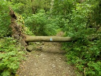 1. tarvágás...igen, a három megmaradt fán vannak a kék jelek, itt kell derékszögben felfelé kanyarodni a hegyre.