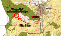 Piros Xjelöli a tábla helyét, piros körpedig a fa valőszínűsíthető helyét, a piros nyíllaljelzet útszakasz hossza kb. 1 km.