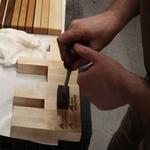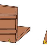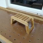 Ha kész a szék, a munkaasztalra állítva, alátétekkel vízszintesre állítod az ülőlapot. Fogsz egy ceruzát, ami alá raksz egy kis lécet, és az asztalra fektetve körülrajzolod a lábakat, aztán a vonalnál levágod.